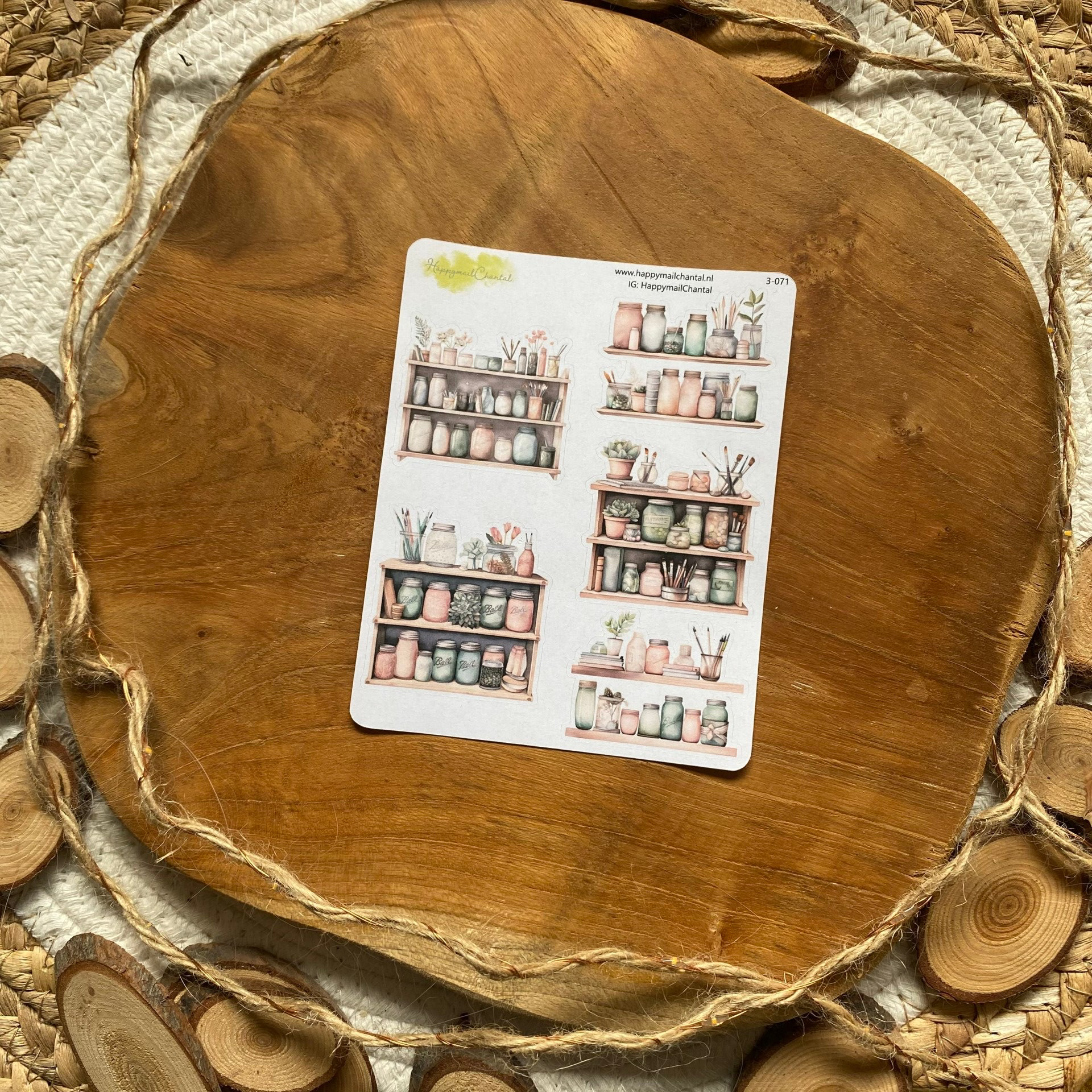 Stickers met illustraties van wandplanken met potjes en hobbymaterialen.