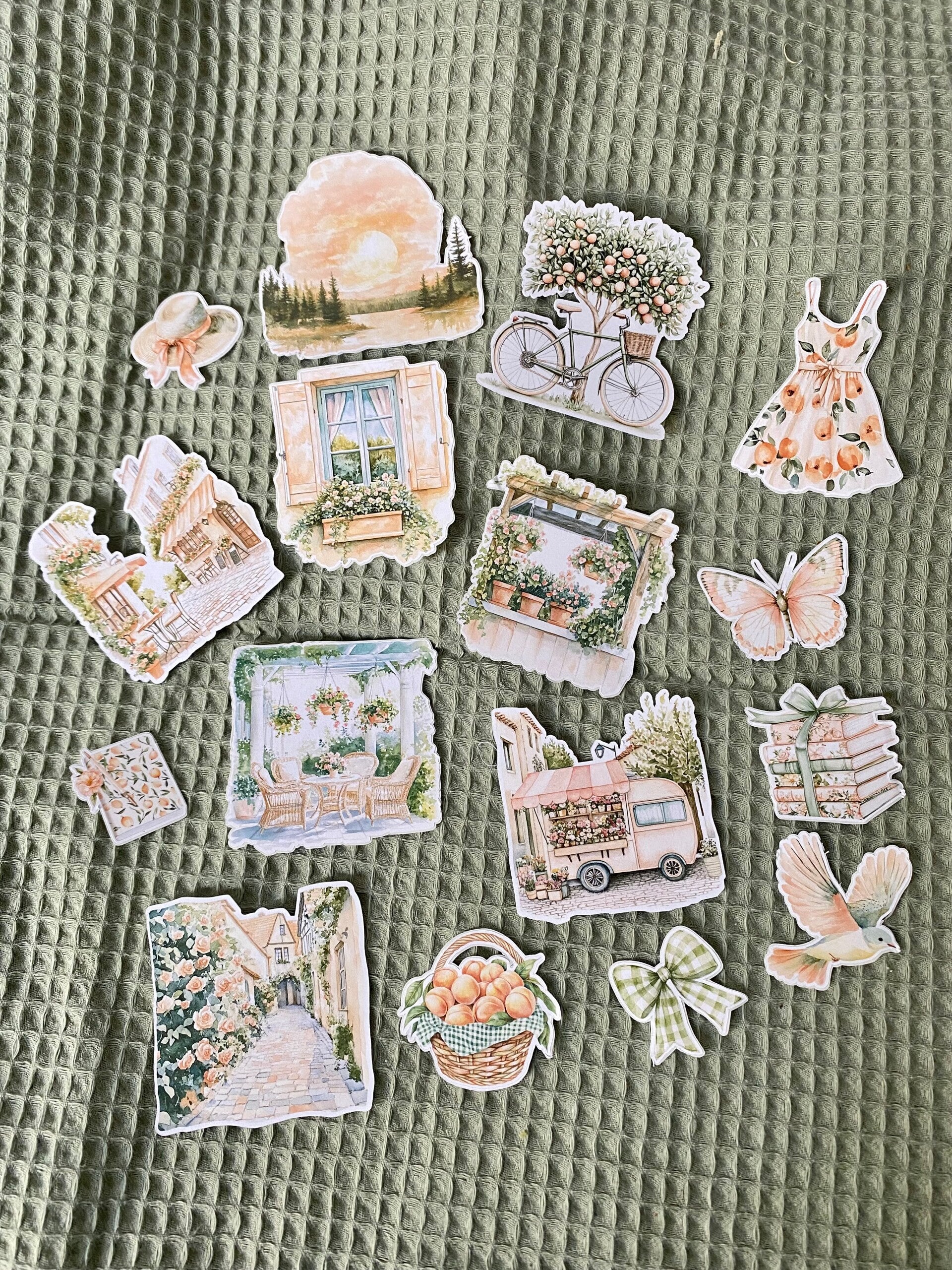 Die cut stickers met elementen in het perzik en sage kleuren pallet.
